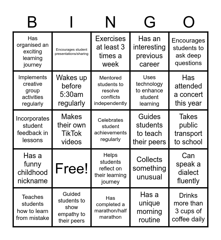 This bingo card has a free space and 24 words: Free!, Guided students to show empathy to their peers, Mentored students to resolve conflicts independently, Teaches students how to learn from mistake, Encourages students to ask deep questions, Has organised an exciting learning journey, Implements creative group activities regularly, Encourages student presentations/sharing, Guides students to teach their peers, Helps students reflect on their learning journey, Uses technology to enhance student learning, Incorporates student feedback in lessons, Collects something unusual, Can speak a dialect fluently, Wakes up before 5:30am regularly, Has a unique morning routine, Takes public transport to school, Exercises at least 3 times a week, Has attended a concert this year, Makes their own TikTok videos, Drinks more than 3 cups of coffee daily, Has a funny childhood nickname, Has an interesting previous career and Has completed a marathon/half marathon.