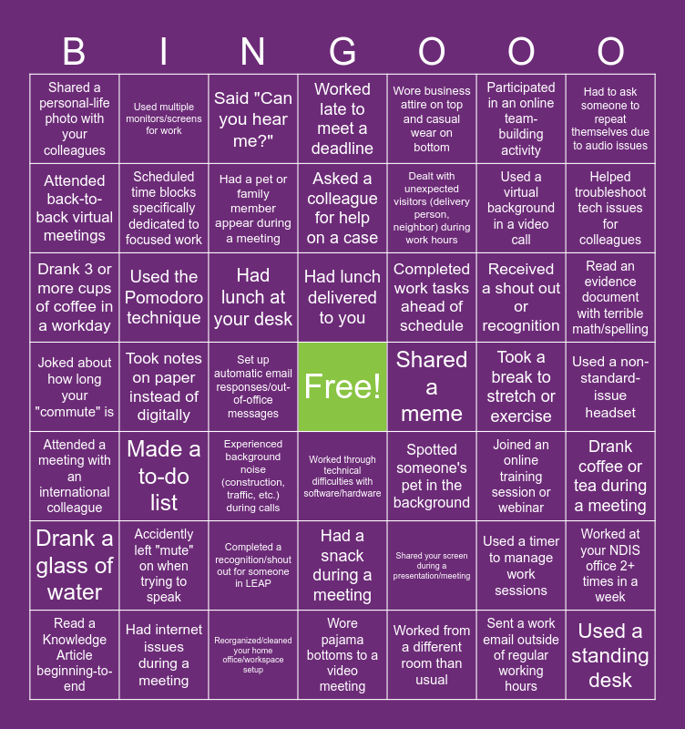 This bingo card has a free space and 52 words: Had internet issues during a meeting, Used a virtual background in a video call, Worked while barefoot, Took notes on paper instead of digitally, Had lunch at your desk, Joined an online training session or webinar, Used multiple monitors/screens for work, Sent a work email outside of regular working hours, Participated in an online team-building activity, Drank coffee or tea during a meeting, Had to ask someone to repeat themselves due to audio issues, Worked through technical difficulties with software/hardware, Received a shout out or recognition, Completed work tasks ahead of schedule, Shared your screen during a presentation/meeting, Experienced background noise (construction, traffic, etc.) during calls, Attended back-to-back virtual meetings, Helped troubleshoot tech issues for colleagues, Reorganized/cleaned your home office/workspace setup, Wore business attire on top and casual wear on bottom, Dealt with unexpected visitors (delivery person, neighbor) during work hours, Set up automatic email responses/out-of-office messages, Shared a personal-life photo with your colleagues, Scheduled time blocks specifically dedicated to focused work, Wore pajama bottoms to a video meeting, Used a standing desk, Used a non-standard-issue headset, Worked from a different room than usual, Had a pet or family member appear during a meeting, Took a break to stretch or exercise, Had a virtual background fail (disappearing body parts, etc.), Worked late to meet a deadline, Had a snack during a meeting, Used a timer to manage work sessions, Attended a meeting with an international colleague, Said "Can you hear me?", Joked about how long your "commute" is, Spotted someone's pet in the background, Drank a glass of water, Accidently left "mute" on when trying to speak, Completed a recognition/shout out for someone in LEAP, Drank 3 or more cups of coffee in a workday, Used the Pomodoro technique, Listened to music while working, Had lunch delivered to you, Shared a meme, Made a to-do list, Asked a colleague for help on a case, Worked at your NDIS office 2+ times in a week, Read a Knowledge Article beginning-to-end, Read an evidence document with terrible math/spelling and Experienced an error or problem with PACE.
