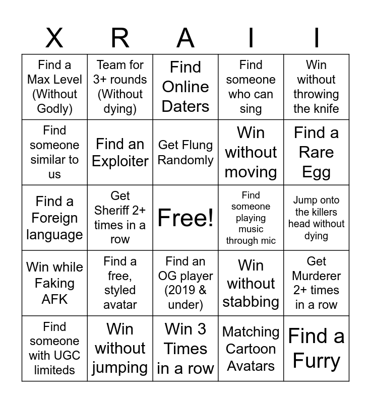 This bingo card has a free space and 24 words: Find someone with UGC limiteds, Find a free, styled avatar, Get Flung Randomly, Matching Cartoon Avatars, Win without throwing the knife, Find a Max Level (Without Godly), Team for 3+ rounds (Without dying), Find Online Daters, Find someone playing music through mic, Jump onto the killers head without dying, Find a Foreign language, Find an Exploiter, Win without stabbing, Get Murderer 2+ times in a row, Find someone similar to us, Win without jumping, Win 3 Times in a row, Find someone who can sing, Find a Rare Egg, Win while Faking AFK, Get Sheriff 2+ times in a row, Find an OG player (2019 & under), Win without moving and Find a Furry.