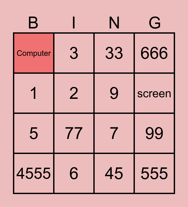 This bingo card has 24 words: tablet, phone, screen, keyboard, 1, Computer, 2, 3, 6, 4, 5, 7, 10, 11, 9, 8, 45, 33, 77, 99, 4555, 555, 666 and 11111.
