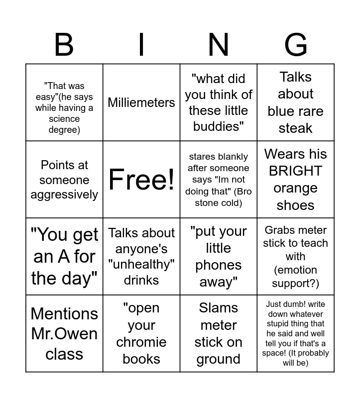 This bingo card has 16 words: "open your chromie books, Grabs meter stick to teach with (emotion support?), "what did you think of these little buddies", "That was easy"(he says while having a science degree), "You get an A for the day", Milliemeters, "put your little phones away", Slams meter stick on ground, Points at someone aggressively, Free!, Mentions Mr.Owen class, Talks about blue rare steak, Talks about anyone's "unhealthy" drinks, Wears his BRIGHT orange shoes, stares blankly after someone says "Im not doing that" (Bro stone cold) and Just dumb! write down whatever stupid thing that he said and well tell you if that's a space! (It probably will be).