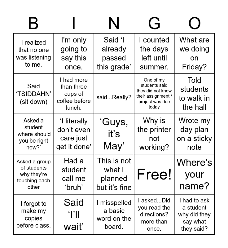 This bingo card has 25 words: Had a student call me ‘bruh’, I misspelled a basic word on the board., I said...Really?, I forgot to make my copies before class., What are we doing on Friday?, I realized that no one was listening to me., Said ‘TSIDDAHN’ (sit down), I'm only going to say this once., Why is the printer not working?, This is not what I planned but it’s fine, One of my students said they did not know their assignment / project was due today, Asked a student ‘where should you be right now?’, Free!, Where's your name?, I had more than three cups of coffee before lunch., I had to ask a student why did they say what they said?, Wrote my day plan on a sticky note, Said ‘I already passed this grade’, Told students to walk in the hall, ‘I literally don’t even care just get it done’, ‘Guys, it’s May’, Said ‘I’ll wait’, Asked a group of students why they’re touching each other, I counted the days left until summer. and I asked...Did you read the directions? more than once..