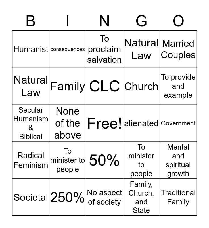 This bingo card has a free space and 24 words: To minister to people, 250%, CLC, Societal, Married Couples, Humanist, Natural Law, consequences, alienated, 50%, Church, Secular Humanism & Biblical, To minister to people, Mental and spiritual growth, Family, Family, Church, and State, Government, To proclaim salvation, To provide and example, None of the above, Traditional Family, Radical Feminism, Natural Law and No aspect of society.