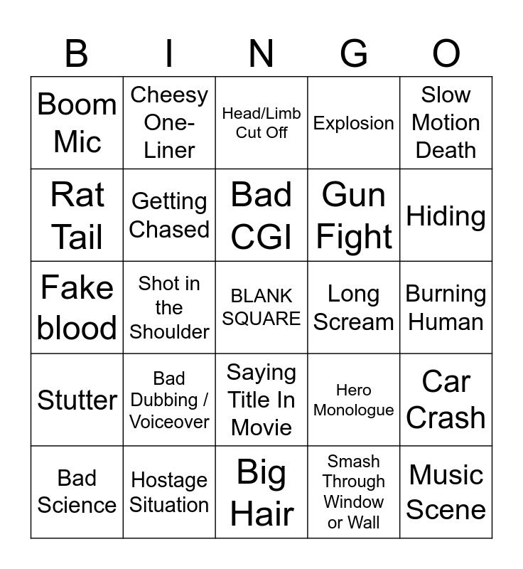 This bingo card has a free space and 41 words: No Reloading, Fake blood, Bag wig, Getting Chased, Hostage Situation, Saying Title In Movie, Bad CGI, Flashback, Slow Motion Death, Stutter, Shot in the Shoulder, Explosion, Music Scene, Burning Human, Long Scream, Bad Dubbing / Voiceover, Bad Dancing, Boom Mic, Stair Fall, Head/Limb Cut Off, Car Crash, Execution, Big Hair, Gun Fight, High Fall, Impaled, Smash Through Window or Wall, Angry Chief of Police, Hiding, Bar Fight, Briefcase full of money/drugs, Cheesy One-Liner, Bad Science, Hero Fights Villain 1v1, Hero Monologue, Rat Tail, Dramatic Silhouette, Villain Dies Twice, Car Exploding Midair, Five Mustaches and Two Days Before Retirement.