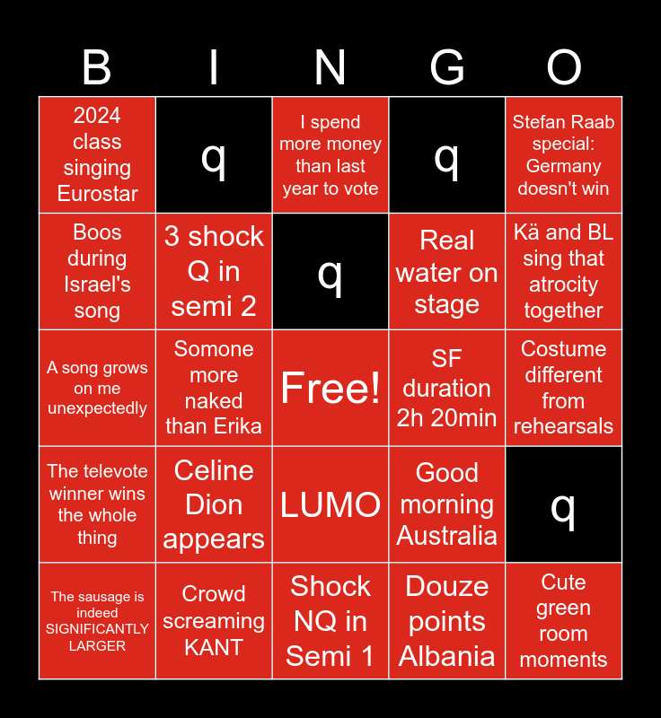 This bingo card has a free space and 29 words: The sausage is indeed SIGNIFICANTLY LARGER, Obviously bad vocals, Somone more naked than Erika, Too many blue stagings, 2024 class singing Eurostar, I spend more money than last year to vote, 3 shock Q in semi 2, Celine Dion appears, SF duration 2h 20min, Crowd screaming KANT, Costume different from rehearsals, Cute green room moments, Shock NQ in Semi 1, Douze points Albania, Kä and BL sing that atrocity together, Albania top 10, LUMO, The televote winner wins the whole thing, Stefan Raab special: Germany doesn't win, A song grows on me unexpectedly, Good morning Australia, Spokesperson millenial pause, Real water on stage, Boos during Israel's song, q, q, q, q and q.