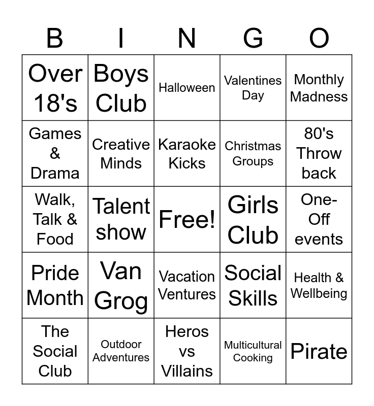 This bingo card has a free space and 24 words: Van Grog, Outdoor Adventures, Karaoke Kicks, The Social Club, Monthly Madness, Over 18's, Games & Drama, Boys Club, Girls Club, Vacation Ventures, Christmas Groups, Walk, Talk & Food, Social Skills, Health & Wellbeing, Creative Minds, Multicultural Cooking, One-Off events, Halloween, 80's Throw back, Talent show, Pirate, Pride Month, Valentines Day and Heros vs Villains.