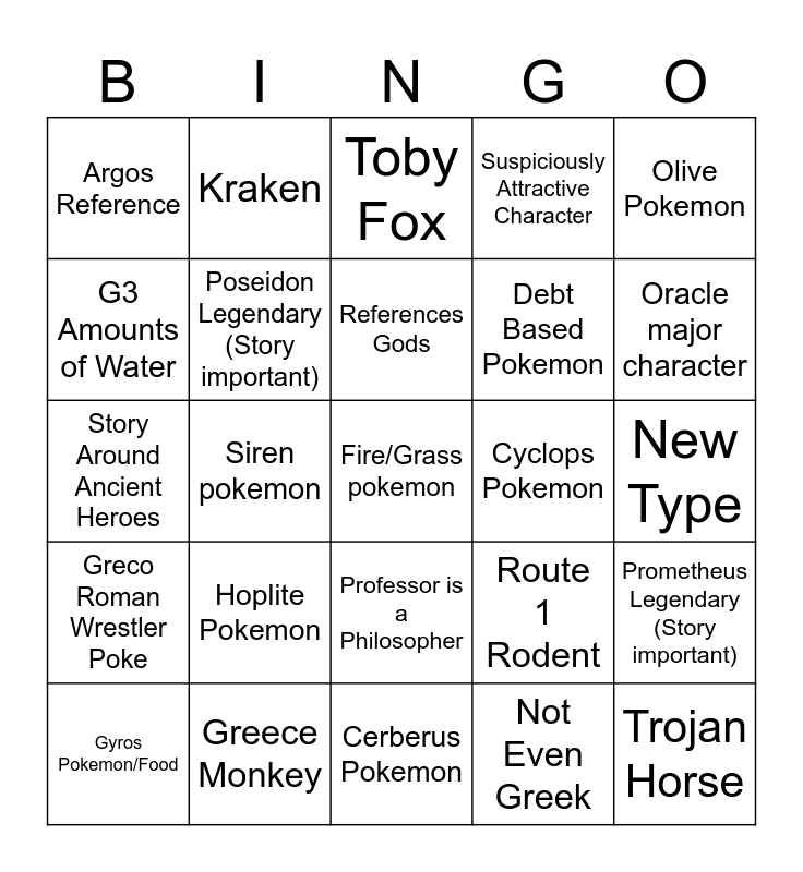 This bingo card has 25 words: Hoplite Pokemon, Cerberus Pokemon, References Gods, Gyros Pokemon/Food, Olive Pokemon, Argos Reference, G3 Amounts of Water, Kraken, Cyclops Pokemon, Professor is a Philosopher, Debt Based Pokemon, Story Around Ancient Heroes, Route 1 Rodent, Prometheus Legendary (Story important), Poseidon Legendary (Story important), Trojan Horse, New Type, Toby Fox, Oracle major character, Siren pokemon, Fire/Grass pokemon, Greece Monkey, Greco Roman Wrestler Poke, Suspiciously Attractive Character and Not Even Greek.