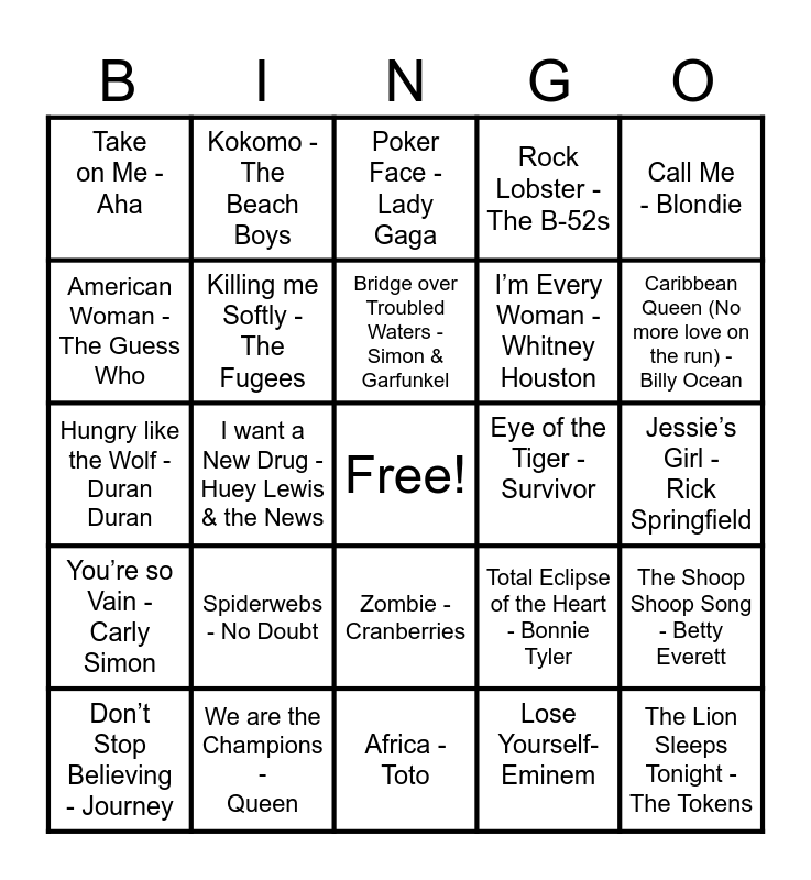 This bingo card has a free space and 44 words: Livin on a Prayer- Bon Jovi, The Lion Sleeps Tonight - The Tokens, Oops I did it again- Britney Spears, Don’t Stop Believing - Journey, Happy - Pharrell Williams, Lose Yourself- Eminem, Poker Face - Lady Gaga, Single Ladies - Beyoncé, Call Me - Blondie, We are the Champions - Queen, Rock Lobster - The B-52s, Eye of the Tiger - Survivor, Zombie - Cranberries, Spiderwebs - No Doubt, Dance Monkey - Tonnes & I, Africa - Toto, Pumped up Kicks - Foster the People, Hungry like the Wolf - Duran Duran, Tainted Love -, Caribbean Queen (No more love on the run) - Billy Ocean, Kokomo - The Beach Boys, Shout - Tears for Fears, Simply Irresistible - Robert Palmer, Take on Me - Aha, Hit me With Your Best Shot - Pat Benatar, Jessie’s Girl - Rick Springfield, We’re not gonna Take it - Twisted Sister, Jump - Van Halen, Total Eclipse of the Heart - Bonnie Tyler, You’re so Vain - Carly Simon, Dancing Queen - ABBA, The Shoop Shoop Song - Betty Everett, Cocaine - Eric Clapton, I’m a Believer- The Monkees, I want a New Drug - Huey Lewis & the News, Pink Houses - John Cougar Mellencamp, Walk like an Egyptian - The Bangles, Fight for your Right (To Party) - Beastie Boys, Bridge over Troubled Waters - Simon & Garfunkel, American Woman - The Guess Who, I’m Every Woman - Whitney Houston, Valerie - Amy Winehouse, Killing me Softly - The Fugees and I think We’re Alone Now - Tiffany.