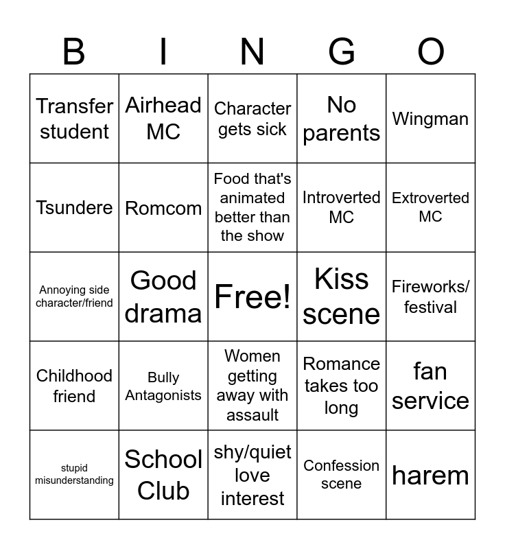 This bingo card has a free space and 24 words: Bully Antagonists, School Club, Food that's animated better than the show, stupid misunderstanding, Wingman, Transfer student, Tsundere, Airhead MC, Kiss scene, Women getting away with assault, Introverted MC, Annoying side character/friend, Romance takes too long, fan service, Romcom, Confession scene, Fireworks/ festival, Character gets sick, Extroverted MC, Good drama, harem, Childhood friend, No parents and shy/quiet love interest.