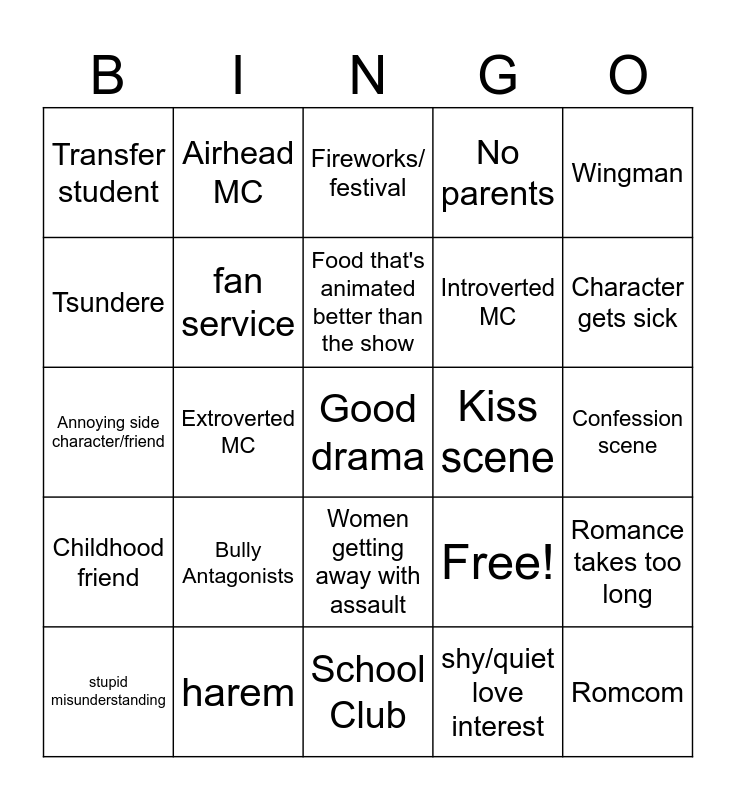 This bingo card has 25 words: Bully Antagonists, School Club, Food that's animated better than the show, stupid misunderstanding, Wingman, Transfer student, Tsundere, Airhead MC, Kiss scene, Women getting away with assault, Introverted MC, Annoying side character/friend, Free!, Romance takes too long, fan service, Romcom, Confession scene, Fireworks/ festival, Character gets sick, Extroverted MC, Good drama, harem, Childhood friend, No parents and shy/quiet love interest.