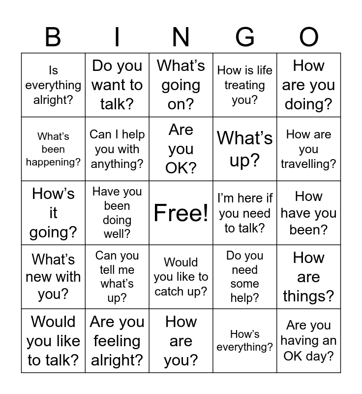 This bingo card has a free space and 25 words: Can you tell me what’s up?, How are you?, Are you OK?, Would you like to talk?, How are you doing?, Is everything alright?, What’s been happening?, Do you want to talk?, I’m here if you need to talk?, Would you like to catch up?, What’s up?, How’s it going?, Do you need some help?, How are things?, Can I help you with anything?, How’s everything?, How have you been?, What’s going on?, How are you travelling?, Have you been doing well?, Are you having an OK day?, Are you feeling alright?, What’s new with you?, How is life treating you? and How’s everything?.