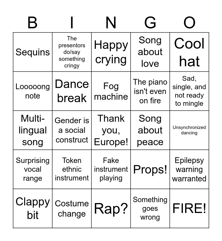 This bingo card has a free space and 44 words: Wind machine!, FIRE!, Shower of sparks, Clappy bit, Modulation, Something goes wrong, Happy crying, What the heck is that outfit?, Cool hat, Costume change, Song about love, Song about peace, Fake instrument playing, Token ethnic instrument, GAY!, Rap?, Twink!, Multi-lingual song, Out of tune, Sad, single, and not ready to mingle, The presentors do/say something cringy, Israeli flag in the audience, Staring into my soul, Sequins, Synchronized dancing, Unsynchronized dancing, Token ethnic costume, Interacting with the visuals, Props!, Surprising vocal range, Token rock song, Epilepsy warning warranted, 360 camera spin, On-screen lyrics, Gender is a social construct, Visuals designed for the home audience, Gaslight Gatekeep Girlboss, Na na na / La la la, Fog machine, Looooong note, The piano isn't even on fire, Cage staging, Dance break and Guitar solo.