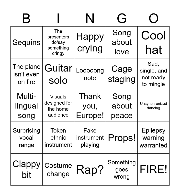 This bingo card has a free space and 45 words: Wind machine!, FIRE!, Shower of sparks, Clappy bit, Modulation, Something goes wrong, Happy crying, What the heck is that outfit?, Cool hat, Costume change, Song about love, Song about peace, Fake instrument playing, Token ethnic instrument, GAY!, Rap?, Twink!, Multi-lingual song, Out of tune, Sad, single, and not ready to mingle, The presentors do/say something cringy, Israeli flag in the audience, Staring into my soul, Sequins, Synchronized dancing, Unsynchronized dancing, Token ethnic costume, Interacting with the visuals, Props!, Surprising vocal range, Token rock song, Epilepsy warning warranted, 360 camera spin, On-screen lyrics, Gender is a social construct, Visuals designed for the home audience, Gaslight Gatekeep Girlboss, Na na na / La la la, Fog machine, Looooong note, The piano isn't even on fire, Cage staging, Dance break, Guitar solo and Singer is flipped.