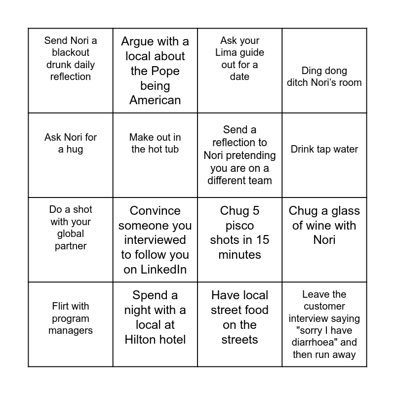 This bingo card has 16 words: Spend a night with a local at Hilton hotel, Chug a glass of wine with Nori, Ask your Lima guide out for a date, Send Nori a blackout drunk daily reflection, Do a shot with your global partner, Argue with a local about the Pope being American, Chug 5 pisco shots in 15 minutes, Have local street food on the streets, Ask Nori for a hug, Make out in the hot tub, Flirt with program managers, Ding dong ditch Nori’s room, Convince someone you interviewed to follow you on LinkedIn, Drink tap water, Send a reflection to Nori pretending you are on a different team and Leave the customer interview saying "sorry I have diarrhoea" and then run away.