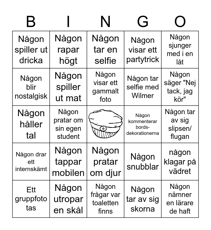 This bingo card has a free space and 24 words: Någon tappar mobilen, Någon utropar en skål, Någon visar ett gammalt foto, Ett gruppfoto tas, Någon sjunger med i en låt, Någon spiller ut dricka, Någon blir nostalgisk, Någon rapar högt, Någon kommenterar bords- dekorationerna, Någon pratar om djur, Någon tar selfie med Wilmer, Någon håller tal, Någon snubblar, någon klagar på vädret, Någon spiller ut mat, Någon tar av sig skorna, Någon tar av sig slipsen/ flugan, Någon tar en selfie, Någon säger "Nej tack, jag kör", Någon pratar om sin egen student, Någon nämner en lärare de haft, Någon drar ett internskämt, Någon visar ett partytrick and Någon frågar var toaletten finns.