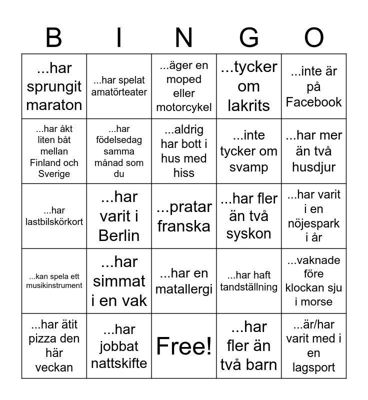 This bingo card has 31 words: Free!, ...har en tatuering, ...har varit i Berlin, ...är rädd för spindlar, ...har sprungit maraton, ...äger en moped eller motorcykel, ...har födelsedag samma månad som du, ...har haft tandställning, ...har fler än två syskon, ...har fler än två barn, ...har varit i en nöjespark i år, ...pratar franska, ...är/har varit med i en lagsport, ...har sovit i tält i år, ...har mer än två husdjur, ...har flyttat utomlands någon gång, ...vaknade före klockan sju i morse, ...har simmat i en vak, ...kan spela ett musikinstrument, ...har en matallergi, ...inte är på Facebook, ...har gått på bio i år, ...har ätit pizza den här veckan, ...har spelat amatörteater, ...inte tycker om svamp, ...har åkt liten båt mellan Finland och Sverige, ...tycker om lakrits, ...har lastbilskörkort, ...har jobbat nattskifte, ...aldrig har bott i hus med hiss and ...aldrig har ätit sniglar.