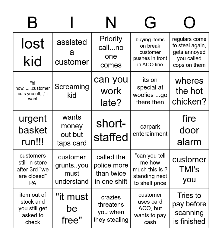This bingo card has 75 words: can you look out the back for xyz, little darlings steal in front of you, Priority call...no one comes, go on break, get stopped by customer, knew exact location for item customer wanted, where is ....while standing next to item, "do you have flybys ? no they flew away, unloads items on your closed register, uses sign as divider, ask customer if they want a bag, get ignored.....finish sale customer says i wanted a bag!, get hit on by customer, Tries to pay before scanning is finished, roll your eyes, dad jokes over headset again, can you work late?, "hi how.......customer cuts you off,,,".i want, drunk customer provides free entertainment, wants money out but taps card, where are the eggs, standing in front of you filling eggs, short-staffed, grabbed something off a top shelf for short customer, regulars come to steal again, gets annoyed you called cops on them, stops dead in front of you, while you have cage, box etc, urgent basket run!!!, Screaming kid, assisted a customer, buying items on break customer pushes in front in ACO line, check the back again, hearing the inner voice say "fall" to the kid running, that's not the price on shelf...go check....price is same as shelf, customer wants to speak to the manager, spot a regular as they walk in, are you sure you dont have it, being asked question thats outside the retail knowedge eg: will this affect my medication, prank phonecalls, "can you tell me how much this is ? standing next to shelf price, wheres the hot chicken?, its on special at woolies ...go there then, can you check if woolies has it?, customers trying to get in after store closers or before it opens, fire door alarm, customer uses card ACO, but wants to pay cash, cardboard crusher goes off through you rumble bag, someone filled item in wrong spot, customer tries to use woolies giftcard, police arrest crazy in store, what time you open too?, someones says the Q or B work at end oif their shift, causing chaos in service, item out of stock and you still get asked to check, lost kid, found money/ bankcard, rude customer card declines and you dont laugh, found random open/ half eaten/ stolen item, called the police more than twice in one shift, truck late or pallets to highand must split the top, ran out of cages, called in on day off, clean up to aisle ..., it doesnt can so must be free, fullmoon crazies out in force, "do you have platic bags?, customer doesnt hand over bags till half way through even though you asked 3 times, customer grunts..you must understand, staff member on 3rd enegry drink, person with stolen items in pocket, guh no toilet paper in staff toilet ...what now, customer asks what is this item ...they are buying, carpark enterainment, fight breaks out, remie runs in front of you in storeroom, item in last spot checked, customer TMI's you, customers still in store after 3rd "we are closed" PA, "it must be free", "do you work here?, crazies threatens you when they stealing and returns without docket, from same day.