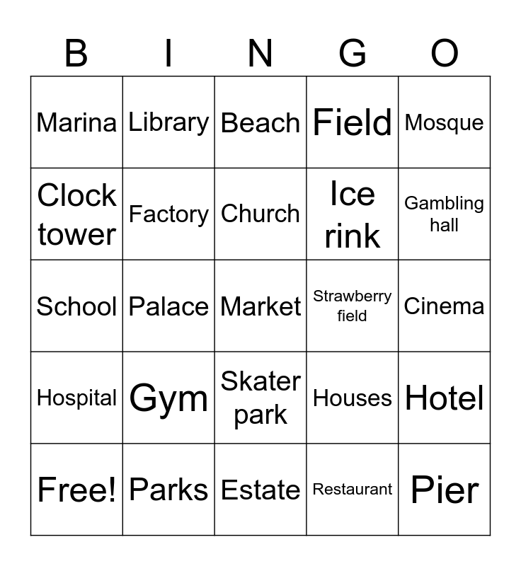 This bingo card has 29 words: Free!, Youth Center, Palace, Pier, Marina, Beach, Factory, Gym, Strawberry field, Parks, Cinema, Market, Estate, Restaurant, Gambling hall, Golf club, Skater park, Hospital, Mosque, School, Houses, Ice cream shop, Ice rink, Clock tower, Field, Library, Hotel, Church and Parking lot.