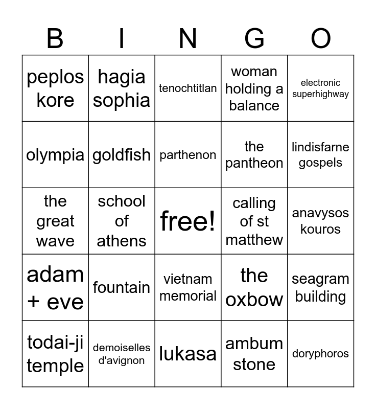 This bingo card has a free space and 24 words: fountain, demoiselles d'avignon, parthenon, todai-ji temple, electronic superhighway, peplos kore, olympia, hagia sophia, calling of st matthew, vietnam memorial, the pantheon, the great wave, the oxbow, seagram building, goldfish, ambum stone, anavysos kouros, tenochtitlan, lindisfarne gospels, school of athens, doryphoros, adam + eve, woman holding a balance and lukasa.