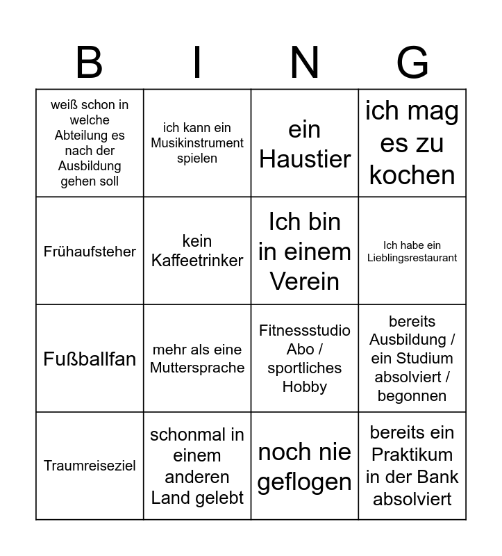 This bingo card has 18 words: mehr als eine Muttersprache, bereits ein Praktikum in der Bank absolviert, ein Haustier, weiß schon in welche Abteilung es nach der Ausbildung gehen soll, Fitnessstudio Abo / sportliches Hobby, ich mag es zu kochen, Traumreiseziel, ich kann ein Musikinstrument spielen, Ich habe ein Lieblingsrestaurant, Fußballfan, noch nie geflogen, Frühaufsteher, bereits Ausbildung / ein Studium absolviert / begonnen, kein Kaffeetrinker, Ich bin in einem Verein, besitzt bereits ein Depot, schonmal in einem anderen Land gelebt and bereits eine Bankkarte verloren.