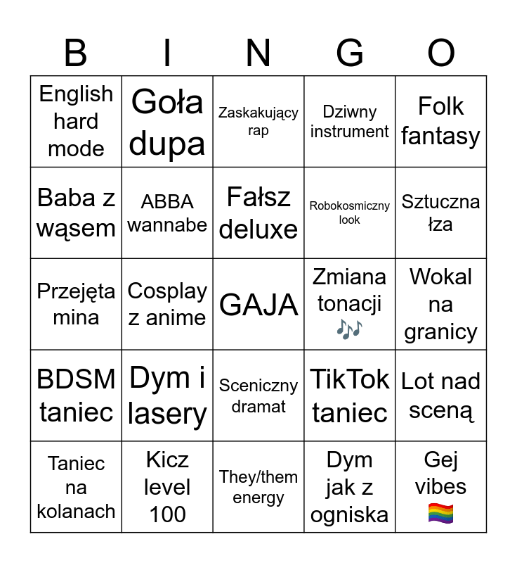 This bingo card has a free space and 50 words: Lampardzica, Gej vibes 🏳️🌈, Brokat & pióra ✨, They/them energy, Dym i lasery, Ogień 🔥, Goła dupa, Ballada = siku, Baba z wąsem, Uszy krwawią, ABBA wannabe, Dziwny instrument, Lot nad sceną, TikTok taniec, Krzyk do publiki, "Unity & peace", Fałsz deluxe, Zmiana tonacji 🎶, Dziwne przebranie, Folk fantasy, Cosplay z anime, Dym jak z ogniska, English hard mode, Robokosmiczny look, Punktowa drama 🎭, Półnagi tancerz, Sztuczna łza, Neon overload, Zaskakujący rap, Sceniczny dramat, Lustrzany kostium, Styl z Aliexpress, Pseudo-etno vibe, Slow-mo taniec, Kicz level 100, Machanie flagą, Cekinowy potwór, Nagle po hiszpańsku, Kamera na stopy (?), Wokal na granicy, Śpiew w deszczu, Niby techno, Głęboki tekst™, Przypadkowy beat drop, Taniec na kolanach, Przejęta mina, Przypadkowy dubstep, AI napisało tekst, BDSM taniec and Czerwone włosy.