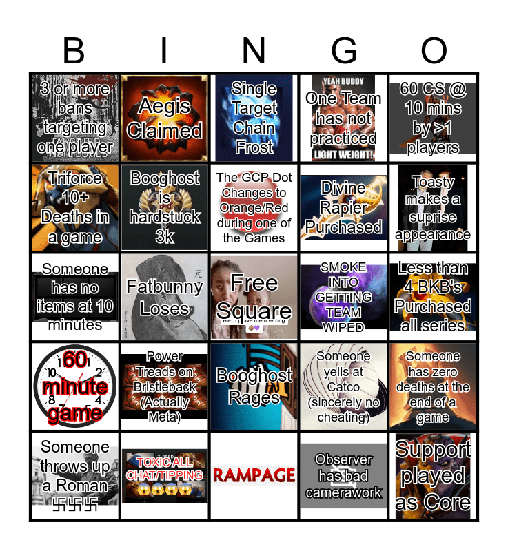 This bingo card has 24 images, a free space and 23 words: Power Treads on Bristleback (Actually Meta), TOXIC ALL CHAT/TIPPING😱😱😱😱, The GCP Dot Changes to Orange/Red during one of the Games, Someone throws up a Roman卐卐卐, 60 CS @ 10 mins by >1 players, 3 or more bans targeting one player, Triforce 10+ Deaths in a game, Aegis Claimed, SMOKE INTO GETTING TEAM WIPED, Booghost Rages, Divine Rapier Purchased, Someone has no items at 10 minutes, Someone yells at Catco (sincerely no cheating), Someone has zero deaths at the end of a game, Booghost is hardstuck 3k, Observer has bad camerawork, Less than 4 BKB's Purchased all series, Single Target Chain Frost, Toasty makes a suprise appearance, Fatbunny Loses, Support played as Core, 60 minute game and One Team has not practiced.