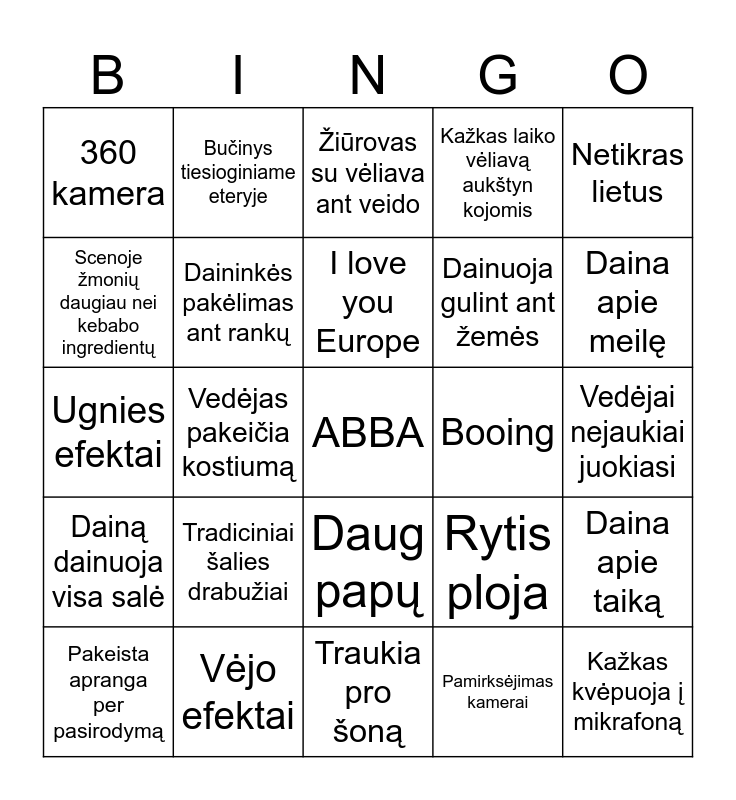 This bingo card has a free space and 24 words: Tradiciniai šalies drabužiai, Vėjo efektai, I love you Europe, Pakeista apranga per pasirodymą, Netikras lietus, 360 kamera, Scenoje žmonių daugiau nei kebabo ingredientų, Bučinys tiesioginiame eteryje, Booing, Daug papų, Dainuoja gulint ant žemės, Ugnies efektai, Rytis ploja, Daina apie taiką, Daininkės pakėlimas ant rankų, Pamirksėjimas kamerai, Vedėjai nejaukiai juokiasi, Žiūrovas su vėliava ant veido, Daina apie meilę, Vedėjas pakeičia kostiumą, Kažkas kvėpuoja į mikrafoną, Dainą dainuoja visa salė, Kažkas laiko vėliavą aukštyn kojomis and Traukia pro šoną.