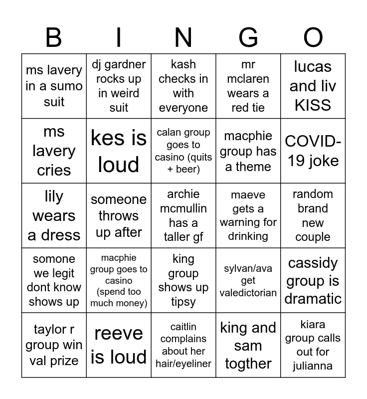 This bingo card has a free space and 24 words: macphie group goes to casino (spend too much money), reeve is loud, calan group goes to casino (quits + beer), taylor r group win val prize, lucas and liv KISS, ms lavery in a sumo suit, ms lavery cries, dj gardner rocks up in weird suit, maeve gets a warning for drinking, king group shows up tipsy, macphie group has a theme, lily wears a dress, sylvan/ava get valedictorian, cassidy group is dramatic, kes is loud, king and sam togther, random brand new couple, kash checks in with everyone, COVID-19 joke, someone throws up after, kiara group calls out for julianna, somone we legit dont know shows up, mr mclaren wears a red tie and caitlin complains about her hair/eyeliner.