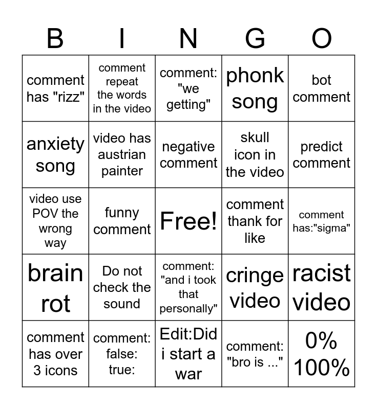 This bingo card has a free space and 24 words: Do not check the sound, comment: false: true:, negative comment, comment has over 3 icons, bot comment, comment has "rizz", anxiety song, comment repeat the words in the video, comment thank for like, comment: "and i took that personally", skull icon in the video, video use POV the wrong way, cringe video, racist video, video has austrian painter, comment: "bro is ...", comment has:"sigma", comment: "we getting", predict comment, funny comment, 0% 100%, brain rot, phonk song and Edit:Did i start a war.