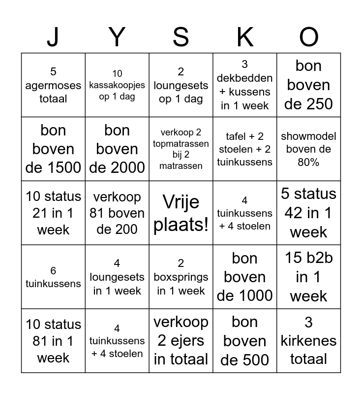 This bingo card has a free space and 24 words: 4 loungesets in 1 week, 4 tuinkussens + 4 stoelen, verkoop 2 topmatrassen bij 2 matrassen, 10 status 81 in 1 week, bon boven de 250, 5 agermoses totaal, bon boven de 1500, 10 kassakoopjes op 1 dag, 4 tuinkussens + 4 stoelen, 2 boxsprings in 1 week, tafel + 2 stoelen + 2 tuinkussens, 10 status 21 in 1 week, bon boven de 1000, 15 b2b in 1 week, bon boven de 2000, bon boven de 500, 5 status 42 in 1 week, 2 loungesets op 1 dag, showmodel boven de 80%, verkoop 81 boven de 200, 3 kirkenes totaal, 6 tuinkussens, 3 dekbedden + kussens in 1 week and verkoop 2 ejers in totaal.