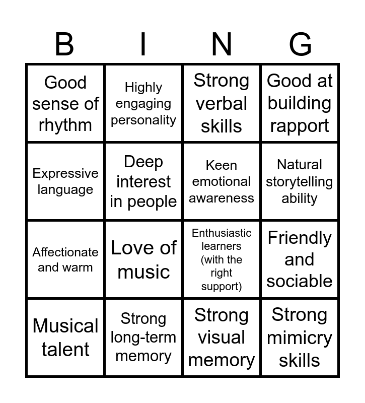 This bingo card has 20 words: Friendly and sociable, Highly empathetic, Strong verbal skills, Excellent memory for faces, Musical talent, Expressive language, Strong long-term memory, Good sense of rhythm, Affectionate and warm, Highly engaging personality, Love of music, Enthusiastic learners (with the right support), Deep interest in people, Strong mimicry skills, Keen emotional awareness, Enjoyment of routine, Natural storytelling ability, Good at building rapport, Strong visual memory and Persistent and determined.