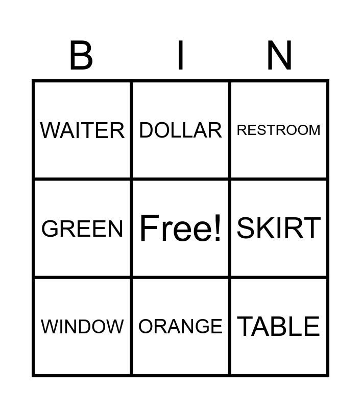 This bingo card has a free space and 8 words: SKIRT, RESTROOM, DOLLAR, WINDOW, WAITER, TABLE, GREEN and ORANGE.