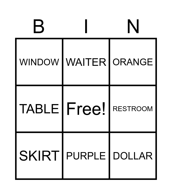 This bingo card has a free space and 9 words: SKIRT, ORANGE, WAITER, TABLE, WINDOW, RESTROOM, DOLLAR, CENT and PURPLE.
