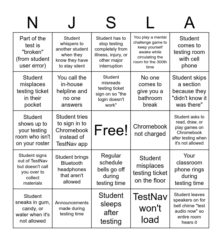 This bingo card has a free space and 24 words: Student brings Bluetooth headphones that aren't allowed, Announcements made during testing time, Student misreads testing ticket sign on so "the login doesn't work", Student sneaks in gum, candy, or water when it's not allowed, Student comes to testing room with cell phone, Part of the test is "broken" (from student user error), Student misplaces testing ticket in their pocket, Student whispers to another student when they know they have to stay silent, Chromebook not charged, Regular schedule bells go off during testing time, No one comes to give you a bathroom break, Student shows up to your testing room who isn't on your roster, Student misplaces testing ticket on the floor, Your classroom phone rings during testing time, You call the in-house helpline and no one answers, TestNav won't load, Student asks to read, draw, or play games on Chromebook after testing when it's not allowed, Student has to stop testing completely from illness, injury, or other major interruption, Student skips a section because they "didn't know it was there", Student tries to sign in to Chromebook instead of TestNav app, Student leaves speakers on for bell chime "test audio now" so entire room hears it, Student signs out of TestNav but doesn't call you over to collect materials, You play a mental challenge game to keep yourself awake while circulating the room for the 300th time and Student sleeps after testing.