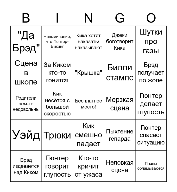 This bingo card has a free space and 24 words: Трюки, Гюнтер говорит глупость, "Крышка", Брэд издевается над Киком, Шутки про газы, "Да Брэд", Сцена в школе, Напоминание, что Гюнтер-Викинг, Мерзкая сцена, Кик смешно падает, Билли стампс, Родители чем-то недовольны, Пыхтение гепарда, Гюнтер спасает ситуацию, За Киком кто-то гонится, Неловкая сцена, Гюнтер делает глупость, Кика хотят наказать/наказывают, Брэд получает по жопе, Кик несётся с большой скоростью, Планы обламываются, Уэйд, Джеки боготворит Кика and Кто-то кричит от ужаса.