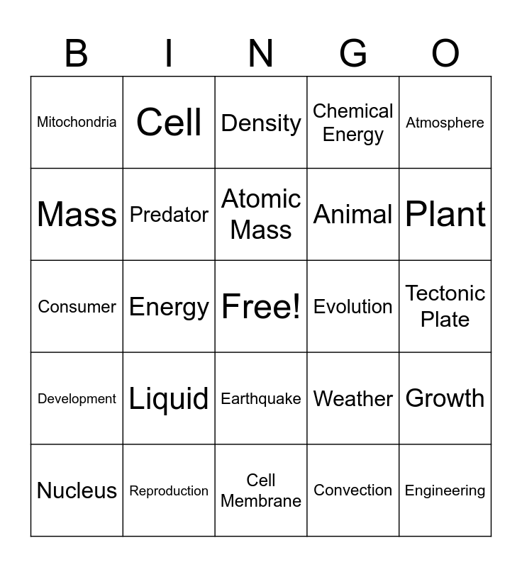 This bingo card has a free space and 76 words: Atom, Molecule, Density, Proton, Neutron, Electron, Bond, Matter, Flammability, Melting Point, Boiling Point, Atomic Number, Atomic Mass, Mass, Volume, Energy, Property, Engineering, Air Mass, Atmosphere, Producer, Consumer, Predator, Cell, Chemical Energy, Chemical Formula, Chemical Reaction, Chromosome, Protein, DNA, RNA, Ribosome, Climate, Weather, Plant, Animal, Abiotic Factor, Biotic Factor, Tectonic Plate, Convection, Variable, Cold Front, Warm Front, Crust, Core, Mantle, Nucleus, Mitochondria, Photosynthesis, Cellular Respiration, Eclipse, Earthquake, Rotation, Revolution, Season, Gravity, Element, Evaporation, Condensation, Solid, Liquid, Gas, Force, Gene, Adaptation, Variation, Evolution, Natural Selection, Genotype, Phenotype, Growth, Development, Reproduction, Chloroplast, Cell Membrane and Cell Wall.