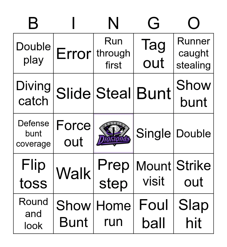This bingo card has a free space and 29 words: Triple, Show Bunt, Run through first, Pickle, Runner caught stealing, Double play, Slide, Steal, Single, Strike out, Round and look, Force out, Foul ball, Slap hit, Defense bunt coverage, Drop Step and run, Home run, Mount visit, Show bunt, Flip toss, Walk, Hit by a pitch, Bunt, Double, Diving catch, Error, Prep step, Tag out and Fly Ball.
