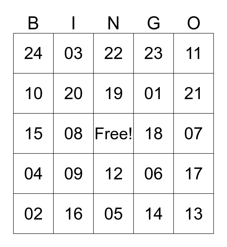 This bingo card has a free space and 24 words: 09, 16, 19, 02, 11, 24, 10, 03, 18, 12, 01, 15, 06, 17, 20, 14, 07, 22, 21, 08, 13, 04, 23 and 05.