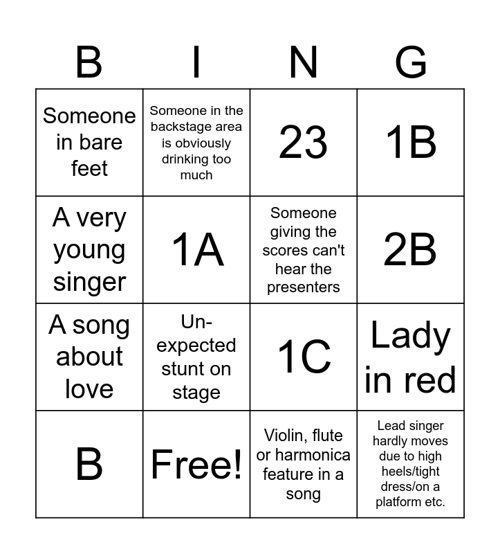 This bingo card has 31 words: Very revealing dress, Smoke machine, Lady in red, A, Someone in bare feet, 23, Someone giving the scores can't hear the presenters, Two key changes in one song, Free!, Clever lighting special effects, Violin, flute or harmonica feature in a song, B, Person giving a country's scores sings, Power ballad, Un-expected stunt on stage, Shoulder pads, 1, An audience member has their face painted as a flag, Lead singer hardly moves due to high heels/tight dress/on a platform etc., New, A very young singer, B, Handheld props, Someone in the backstage area is obviously drinking too much, A song about love, 1A, 1B, 1C, 2A, 2B and 2C.