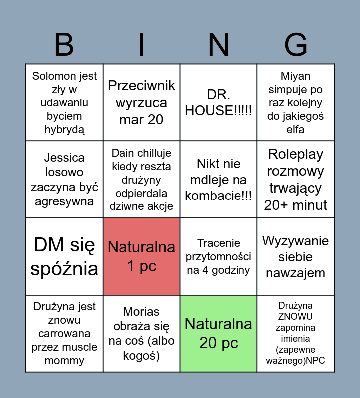 This bingo card has 16 words: Morias obraża się na coś (albo kogoś), Wyzywanie siebie nawzajem, DR. HOUSE!!!!!, Solomon jest zły w udawaniu byciem hybrydą, DM się spóźnia, Przeciwnik wyrzuca mar 20, Tracenie przytomności na 4 godziny, Naturalna 20 pc, Jessica losowo zaczyna być agresywna, Dain chilluje kiedy reszta drużyny odpierdala dziwne akcje, Drużyna jest znowu carrowana przez muscle mommy, Miyan simpuje po raz kolejny do jakiegoś elfa, Naturalna 1 pc, Roleplay rozmowy trwający 20+ minut, Nikt nie mdleje na kombacie!!! and Drużyna ZNOWU zapomina imienia (zapewne ważnego)NPC.