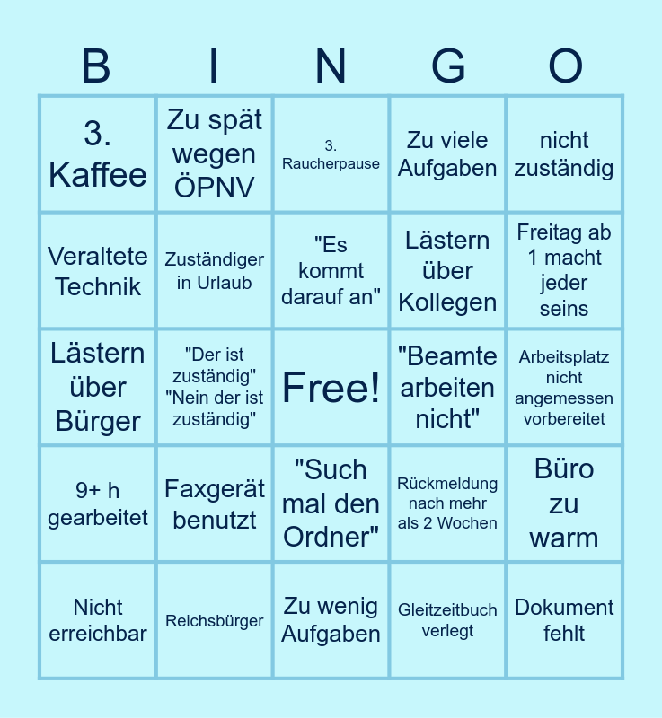 This bingo card has a free space and 24 words: Faxgerät benutzt, Reichsbürger, "Es kommt darauf an", Nicht erreichbar, nicht zuständig, 3. Kaffee, Veraltete Technik, Zu spät wegen ÖPNV, "Beamte arbeiten nicht", "Such mal den Ordner", Lästern über Kollegen, Lästern über Bürger, Rückmeldung nach mehr als 2 Wochen, Büro zu warm, Zuständiger in Urlaub, Gleitzeitbuch verlegt, Arbeitsplatz nicht angemessen vorbereitet, 3. Raucherpause, Freitag ab 1 macht jeder seins, "Der ist zuständig" "Nein der ist zuständig", Dokument fehlt, 9+ h gearbeitet, Zu viele Aufgaben and Zu wenig Aufgaben.
