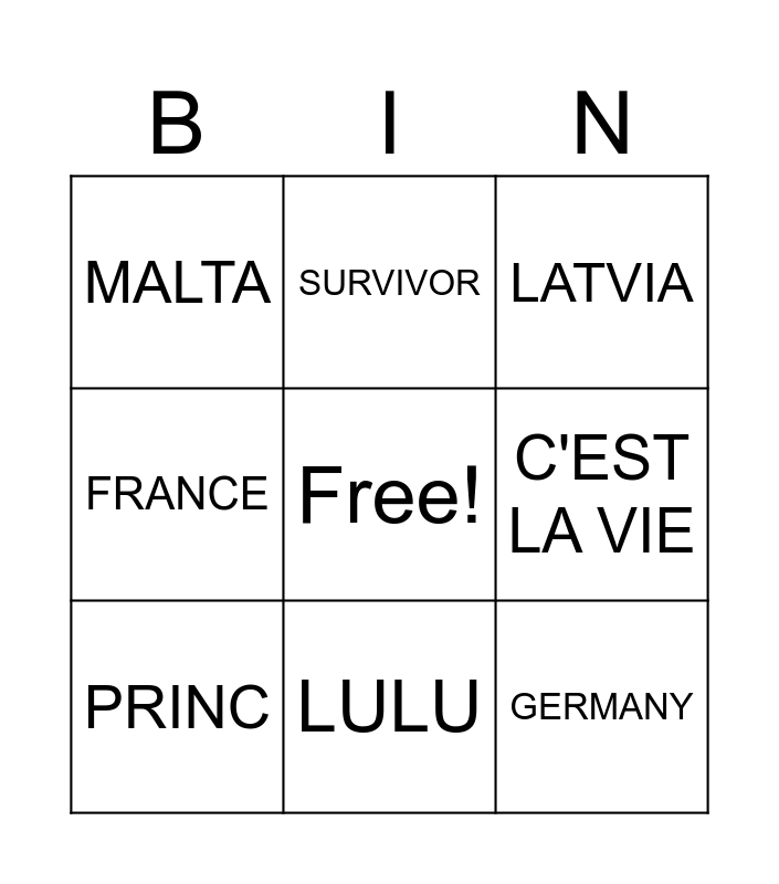 This bingo card has a free space and 70 words: ALBANIA, ARMENIA, AUSTRALIA, AUSTRIA, CYPRUS, DENMARK, FRANCE, ICELAND, GERMANY, GREECE, IRELAND, ITALY, MALTA, LATVIA, NORWAY, NETHERLANDS, POLAND, PORTUGAL, SPAIN, SWEDEN, SWITZERLAND, UKRAINE, UNITED KINGDOM, EUROVISION 2025, BASEL, REMEMBER MONDAY, MILKSHAKE MAN, RUN WITH U, WASTED LOVE, ZJERM, SURVIVOR, STROBE LIGHTS, POISON CAKE, SHH, KISS KISS GOODBYE, FREEDOM, BALLER, ROA, NEW DAY WILL RISE, C'EST LA VIE, LIGHTER, MILA, BIRD OF PREY, KAJ, KLEMEN, PRINC, CLAUDE, LAURA THORN, EMMY, BASEL 2025, NIL POINTS, 10 POINTS, 5 POINTS, 1 POINT, 2 POINTS, SANDIE SHAW, LULU, BUCKS FIZZ, KATRINA AND THE WAVES, BROTHERHOOD OF MAN, PUPPET ON A STRING, BOOM BANG-A-BANG, SAVE YOUR KISSES FOR ME, MAKING YOUR MIND UP, LOVE SHINE A LIGHT, 1967, 1969, 1976, 1981 and 1997.
