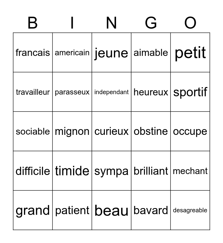 This bingo card has a free space and 24 words: grand, timide, independant, bavard, petit, francais, americain, jeune, obstine, occupe, sociable, parasseux, brilliant, mechant, travailleur, patient, beau, aimable, sportif, difficile, mignon, sympa, heureux and desagreable.