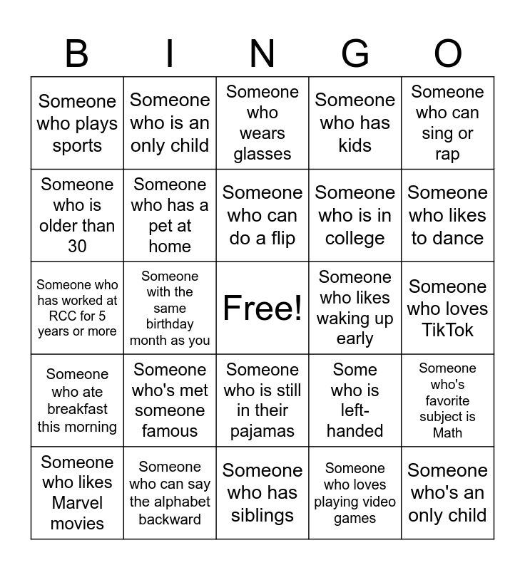 This bingo card has a free space and 31 words: Someone who has siblings, Someone who has been out of state, Someone with the same birthday month as you, Someone who has broken a bone, Someone who plays sports, Someone who wears glasses, Someone who has a pet at home, Some who is left-handed, Someone who likes waking up early, Someone who loves playing video games, Someone who loves TikTok, Someone who's an only child, Someone who is afraid of spiders, Someone who's favorite food is pizza, Someone who likes to dance, Someone who is a Lakers fan, Someone who's favorite subject is Math, Someone who's met someone famous, Someone who ate breakfast this morning, Someone who is still in their pajamas, Someone who can sing or rap, Someone who has the same favorite color as you, Someone who likes Marvel movies, Someone who is an only child, Someone who is in college, Someone who is older than 30, Someone who has kids, Someone who has worked at RCC for 5 years or more, Someone who can say the alphabet backward, Someone who can do a flip and Someone who can roll their tongue.