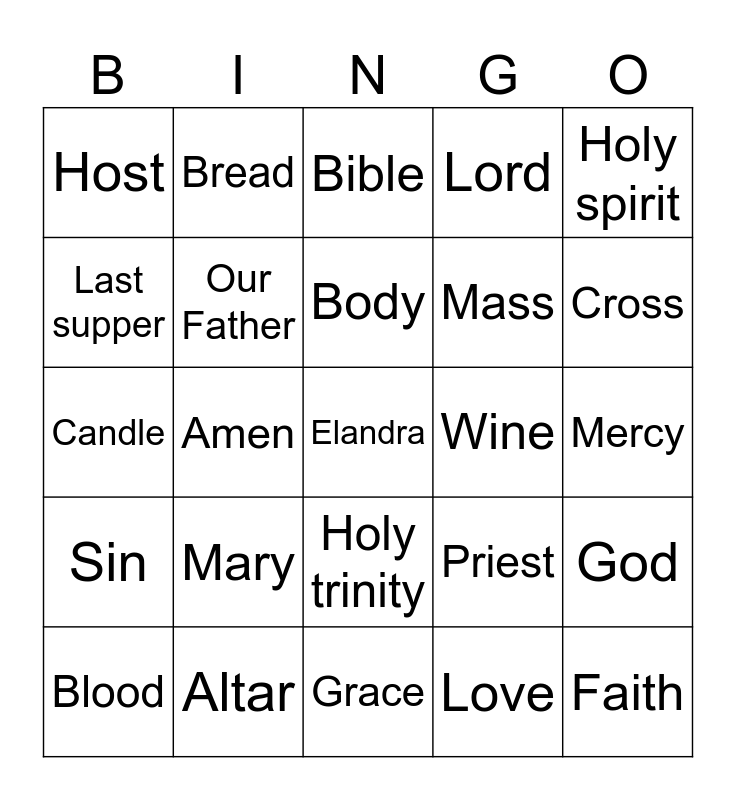 This bingo card has a free space and 24 words: Mary, Altar, Body, Blood, Holy spirit, Host, Last supper, Bread, Wine, Holy trinity, Mass, Candle, Priest, God, Our Father, Love, Mercy, Bible, Cross, Amen, Faith, Sin, Lord and Grace.