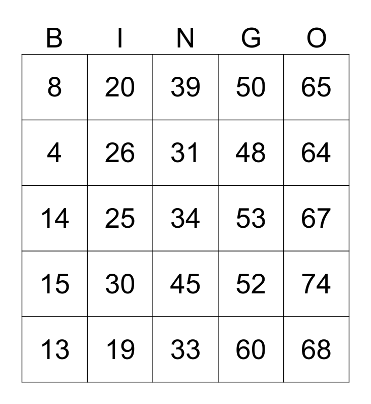 This bingo card has 75 words: 1, 16, 31, 46, 61, 2, 17, 32, 47, 62, 3, 18, 45, 48, 63, 4, 19, 33, 49, 64, 5, 20, 34, 50, 65, 6, 21, 35, 51, 66, 7, 22, 36, 52, 67, 8, 23, 37, 53, 68, 9, 24, 38, 54, 69, 10, 25, 39, 55, 70, 11, 26, 40, 56, 71, 12, 27, 41, 57, 72, 13, 28, 42, 58, 73, 14, 29, 43, 59, 74, 15, 30, 44, 60 and 75.