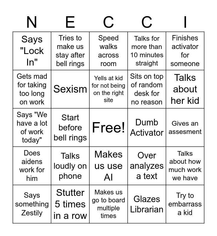 This bingo card has a free space and 30 words: Stutter 5 times in a row, Crash out, Start before bell rings, Gets mad at innocent, Says "Lock In", Speed walks across room, Sexism, Makes us use AI, Dumb Activator, Makes us go to board multiple times, Gives an assesment, Try to embarrass a kid, Glazes Librarian, Tells us to be more prepared for class, Talks about her kid, Repeatedly says the same thing like its something different, Over analyzes a text, Does aidens work for him, Talks loudly on phone, Finishes activator for someone, Says "We have a lot of work today", Makes a joke and no one laughs, Tries to make us stay after bell rings, Sits on top of random desk for no reason, Gets mad for taking too long on work, Talks for more than 10 minutes straight, Talks about how much work we have, Says something Zestily, Yells at kid for not being on the right site and Mentions honors class.