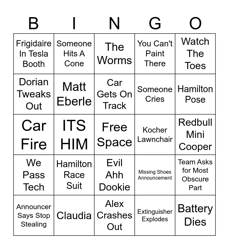 This bingo card has a free space and 24 words: Hamilton Race Suit, Claudia, Car Gets On Track, Announcer Says Stop Stealing, Watch The Toes, Frigidaire In Tesla Booth, Dorian Tweaks Out, Someone Hits A Cone, Kocher Lawnchair, Evil Ahh Dookie, Someone Cries, Car Fire, Missing Shoes Announcement, Team Asks for Most Obscure Part, Matt Eberle, Extinguisher Explodes, Redbull Mini Cooper, The Worms, Hamilton Pose, ITS HIM, Battery Dies, We Pass Tech, You Can't Paint There and Alex Crashes Out.