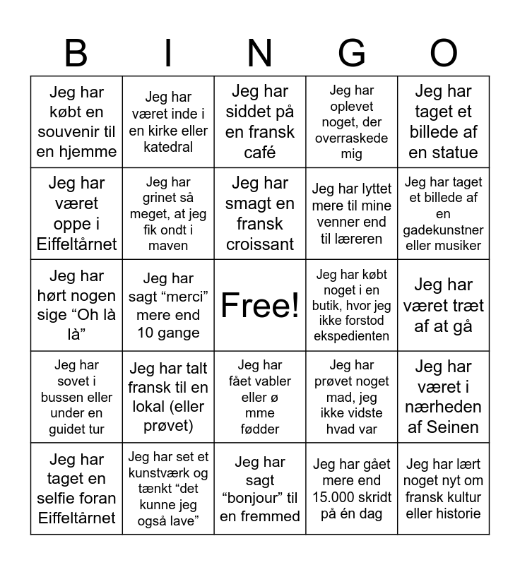 This bingo card has a free space and 24 words: Jeg har taget en selfie foran Eiffeltårnet, Jeg har talt fransk til en lokal (eller prøvet), Jeg har smagt en fransk croissant, Jeg har gået mere end 15.000 skridt på én dag, Jeg har taget et billede af en statue, Jeg har købt en souvenir til en hjemme, Jeg har været inde i en kirke eller katedral, Jeg har siddet på en fransk café, Jeg har købt noget i en butik, hvor jeg ikke forstod ekspedienten, Jeg har været træt af at gå, Jeg har hørt nogen sige “Oh là là”, Jeg har grinet så meget, at jeg fik ondt i maven, Jeg har prøvet noget mad, jeg ikke vidste hvad var, Jeg har været i nærheden af Seinen, Jeg har været oppe i Eiffeltårnet, Jeg har set et kunstværk og tænkt “det kunne jeg også lave”, Jeg har sagt “bonjour” til en fremmed, Jeg har oplevet noget, der overraskede mig, Jeg har taget et billede af en gadekunstner eller musiker, Jeg har sovet i bussen eller under en guidet tur, Jeg har sagt “merci” mere end 10 gange, Jeg har fået vabler eller ømme fødder, Jeg har lyttet mere til mine venner end til læreren and Jeg har lært noget nyt om fransk kultur eller historie.