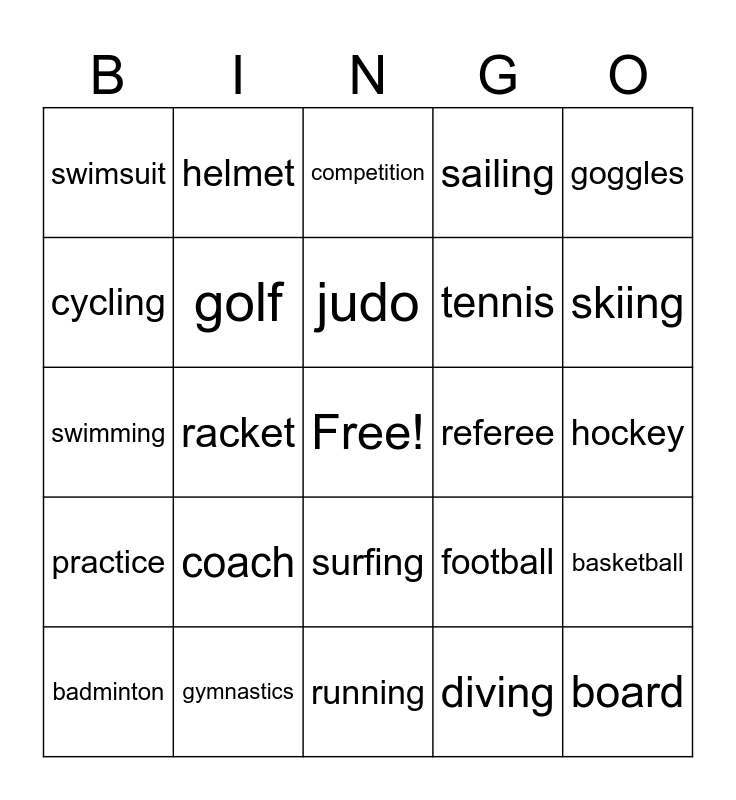 This bingo card has a free space and 24 words: badminton, coach, judo, diving, goggles, swimsuit, helmet, competition, referee, hockey, swimming, golf, football, basketball, cycling, gymnastics, running, sailing, skiing, practice, racket, surfing, tennis and board.